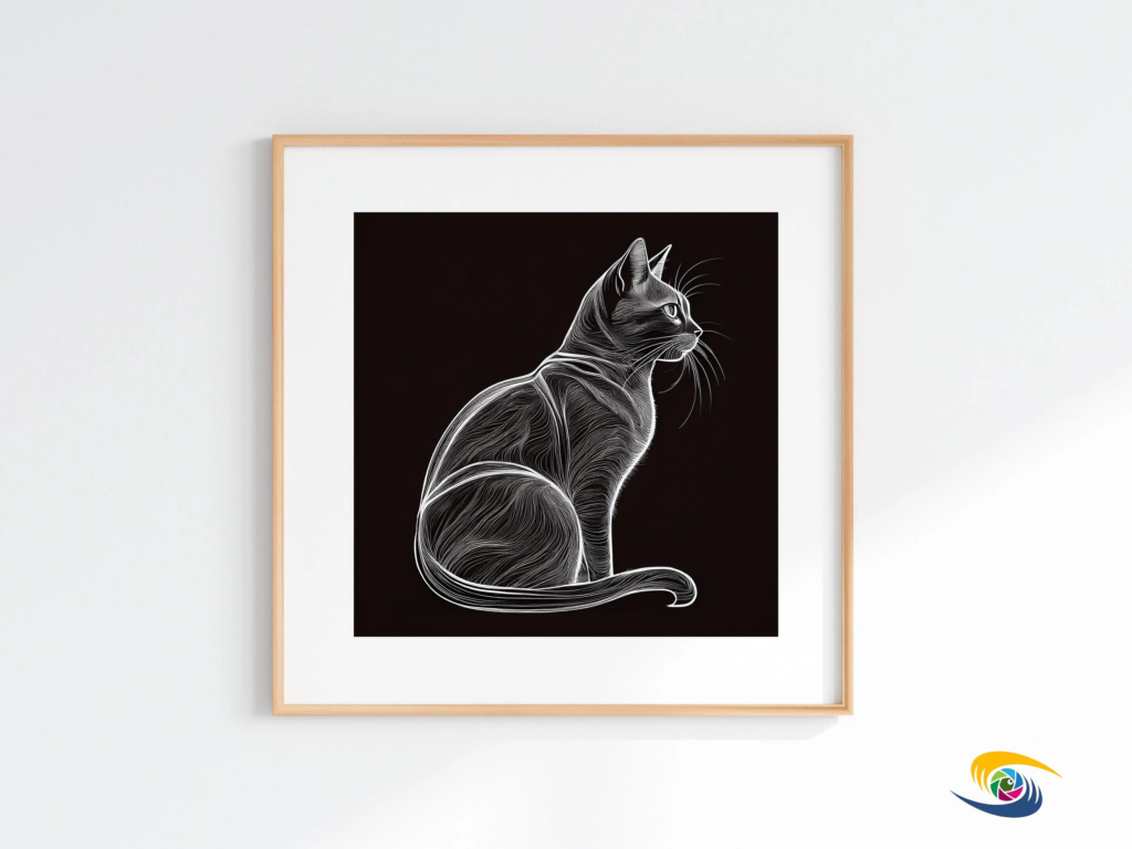 Etching-style drawings have a unique charm. They evoke the craftsmanship of traditional printmaking while offering a contemporary twist. This piece uses fine white lines to create intricate details, giving the cat a lifelike yet artistic appearance. The black-and-white contrast ensures it stands out in any setting. You can frame it for your living room. Alternatively, you can add it to a gallery wall.